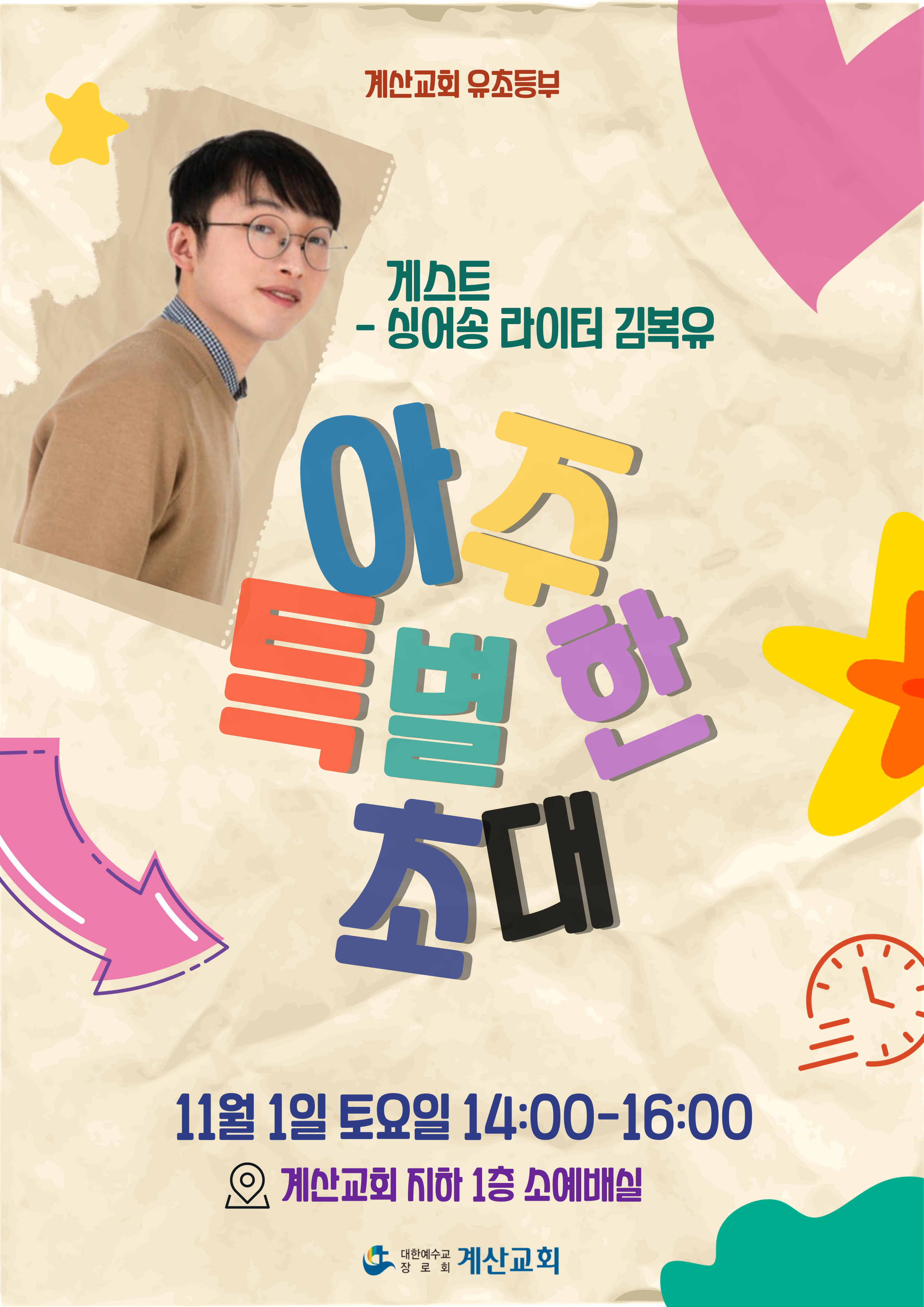 11/1 오늘은 유초등부가 함께하는 아주 특별한 초대 전도축제날이에요! 오후 2시-4시까지 부서 친구들, 새 친구들과 모여 뜻깊은 시간을 가졌습니다